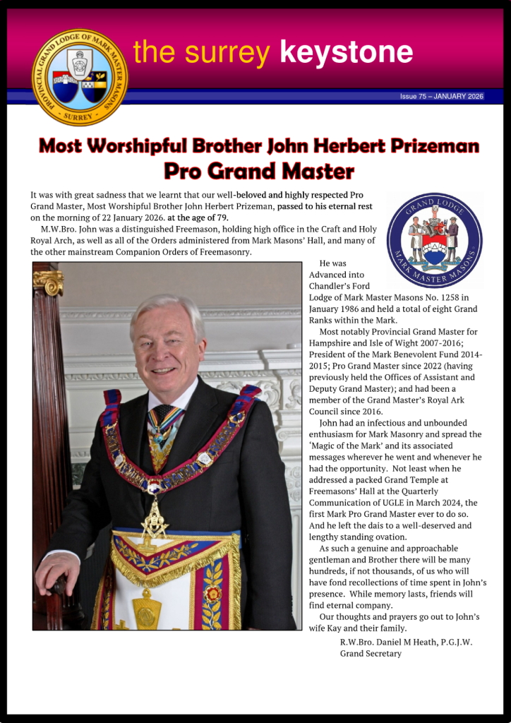 Most Worshipful Brother John Herbert Prizeman Pro Grand Master Post author:Ian Vincent Post published:28 January 2026 Post category:News https://www.surreycompanionorders.com/news-master You Might Also Like Provincial Almoners Weekly Letter 19 December 2020 Provincial Grand Masters Address 17 April 2021 17 April 2021 Provincial Grand Master’s Easter Message 12 April 2020